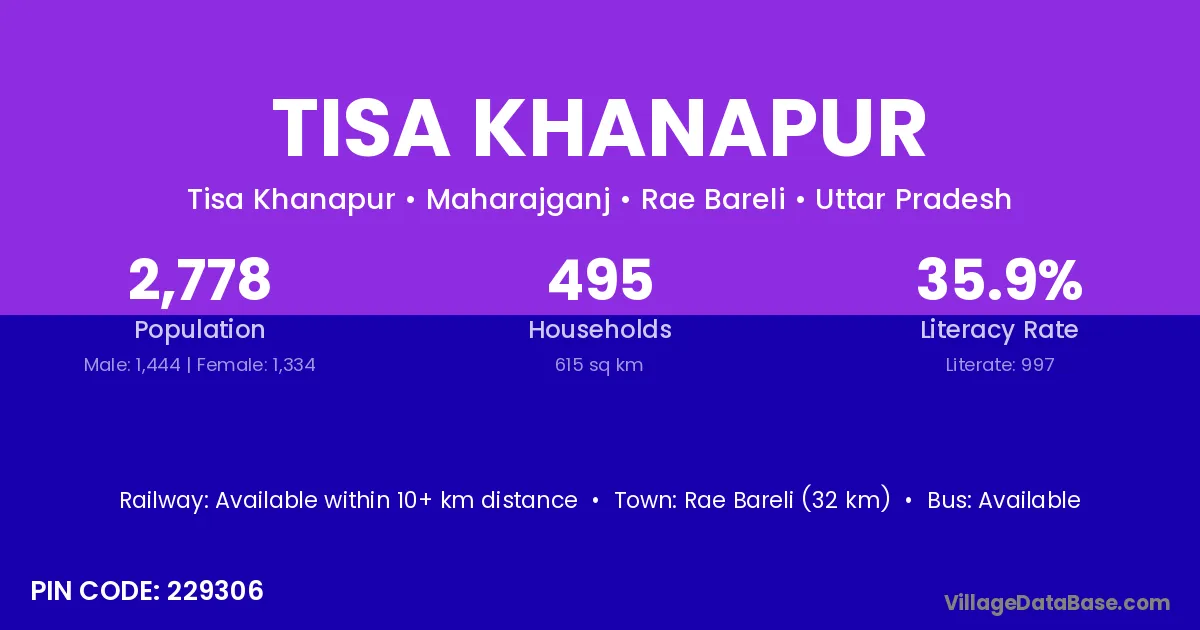 Rae Bareli (32 km) is the nearest town to Tisa Khanapur village for major economic activities and is located approximately 32 km away.