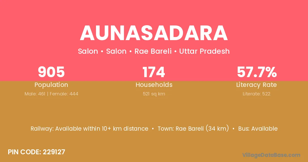 Rae Bareli (34 km) is the nearest town to Aunasadara village for major economic activities and is located approximately 34 km away.