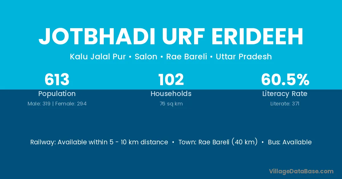 Rae Bareli (40 km) is the nearest town to Jotbhadi Urf Erideeh village for major economic activities and is located approximately 40 km away.