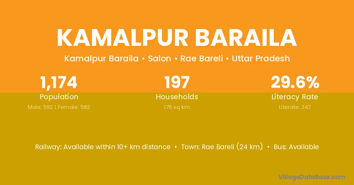 Rae Bareli (24 km) is the nearest town to Kamalpur Baraila village for major economic activities and is located approximately 24 km away.