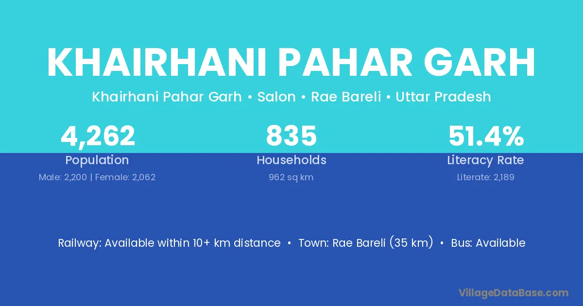 Rae Bareli (35 km) is the nearest town to Khairhani Pahar Garh village for major economic activities and is located approximately 35 km away.