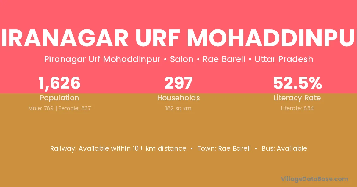 Piranagar Urf Mohaddinpur village has a total population of 1,626 people, of which 789 are males and 837 are females.
