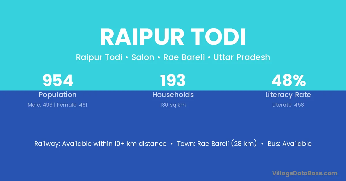 Rae Bareli (28 km) is the nearest town to Raipur Todi village for major economic activities and is located approximately 28 km away.