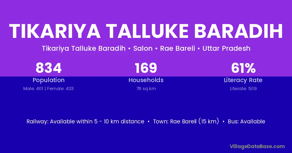 Rae Bareli (15 km) is the nearest town to Tikariya Talluke Baradih village for major economic activities and is located approximately 15 km away.
