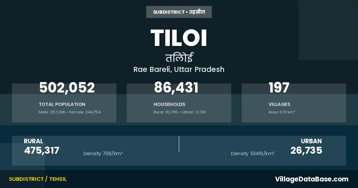 According to the 2011 census The total area of Tiloi Tehsil is 672 km², with a population of 502052 people. The population density is 747 inhabitants per square kilometre, and there are approximately 86431 houses in the sub district.