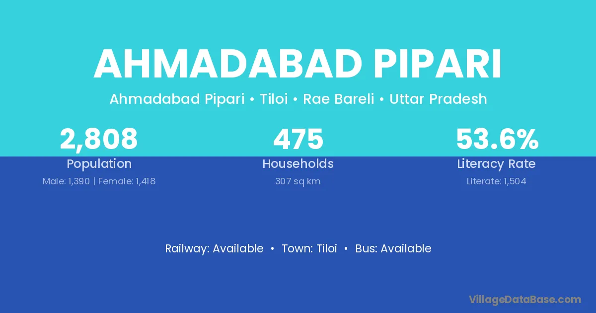 Ahmadabad Pipari village has a total population of 2,808 people, of which 1,390 are males and 1,418 are females.