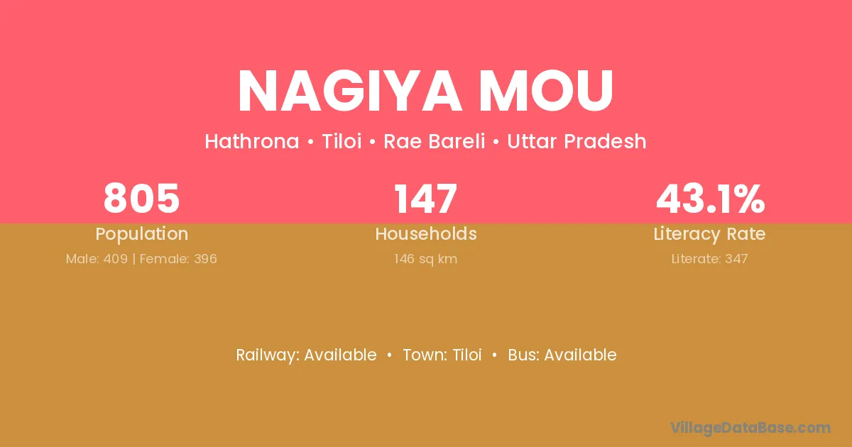 Nagiya Mou village has a total population of 805 people, of which 409 are males and 396 are females.