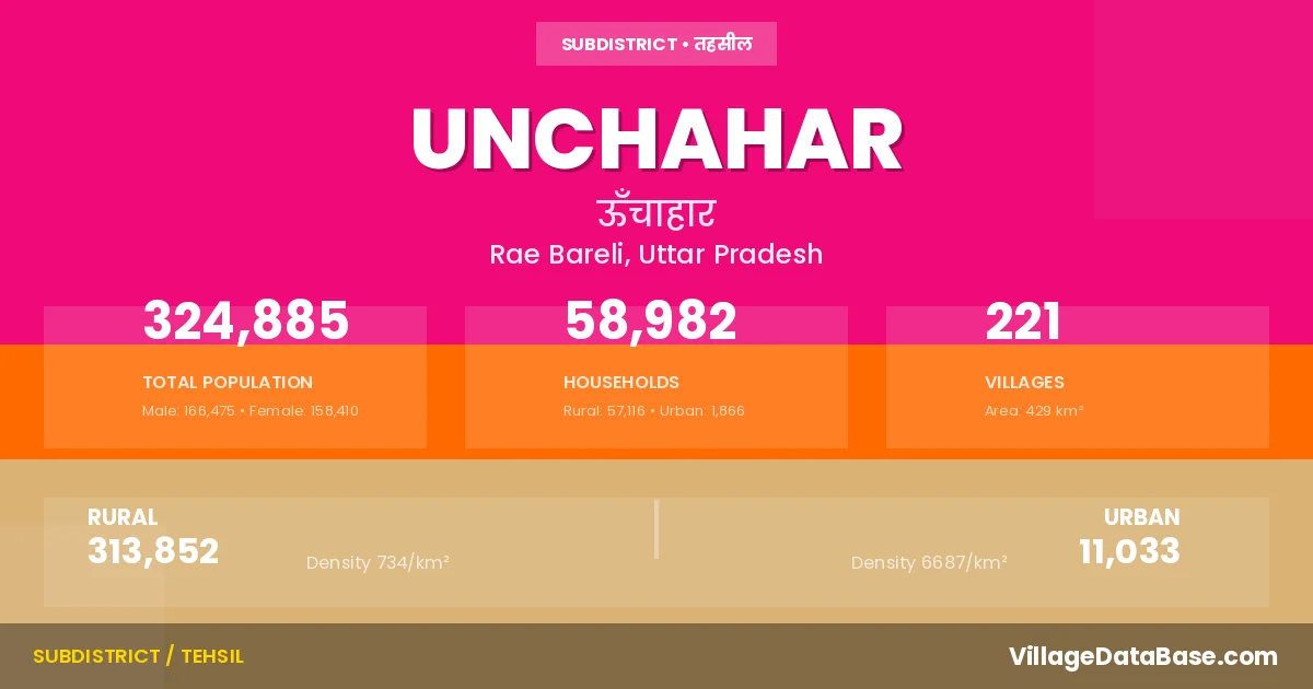 According to the 2011 census The total area of Unchahar Tehsil is 429 km², with a population of 324885 people. The population density is 757 inhabitants per square kilometre, and there are approximately 58982 houses in the sub district.