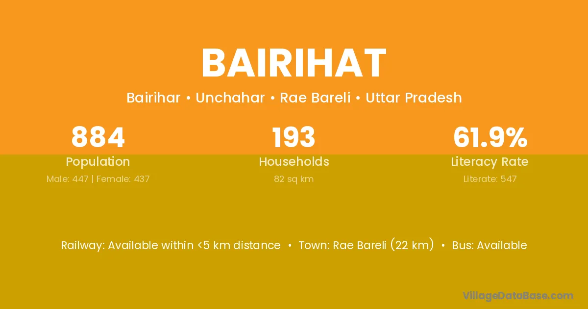 Rae Bareli (22 km) is the nearest town to Bairihat village for major economic activities and is located approximately 22 km away.