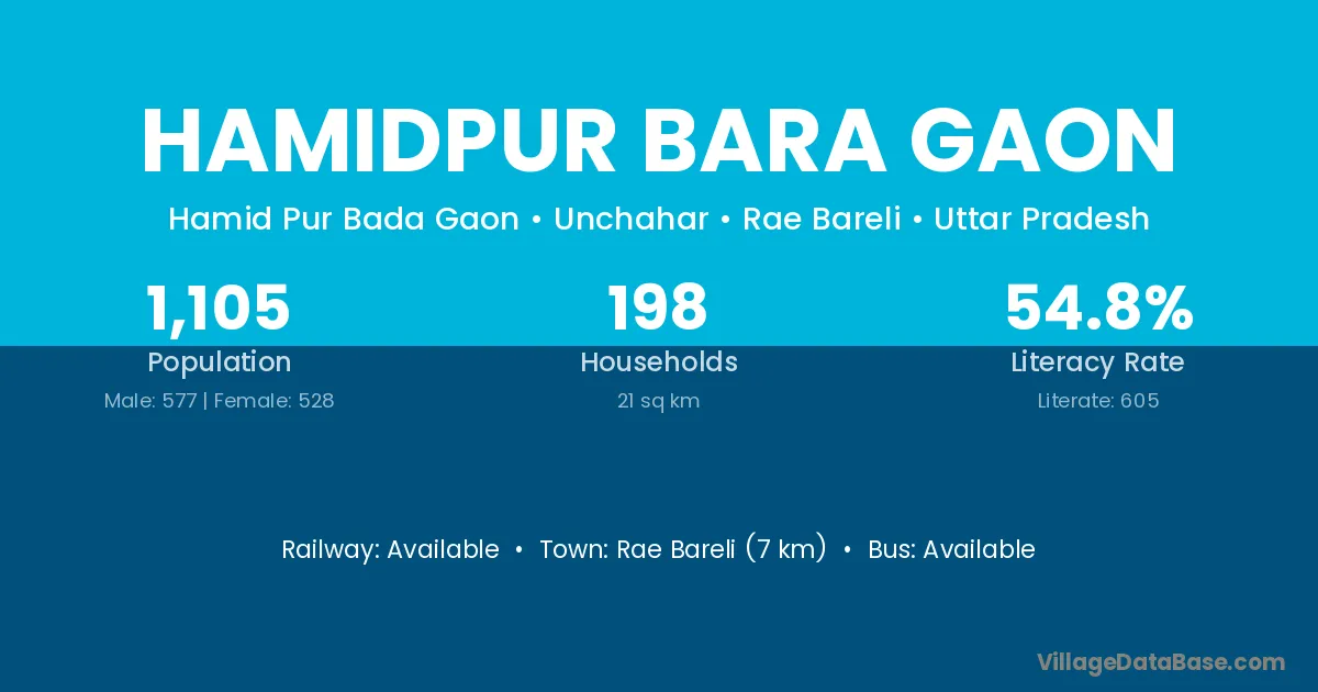 Rae Bareli (7 km) is the nearest town to Hamidpur Bara Gaon village for major economic activities and is located approximately 7 km away.