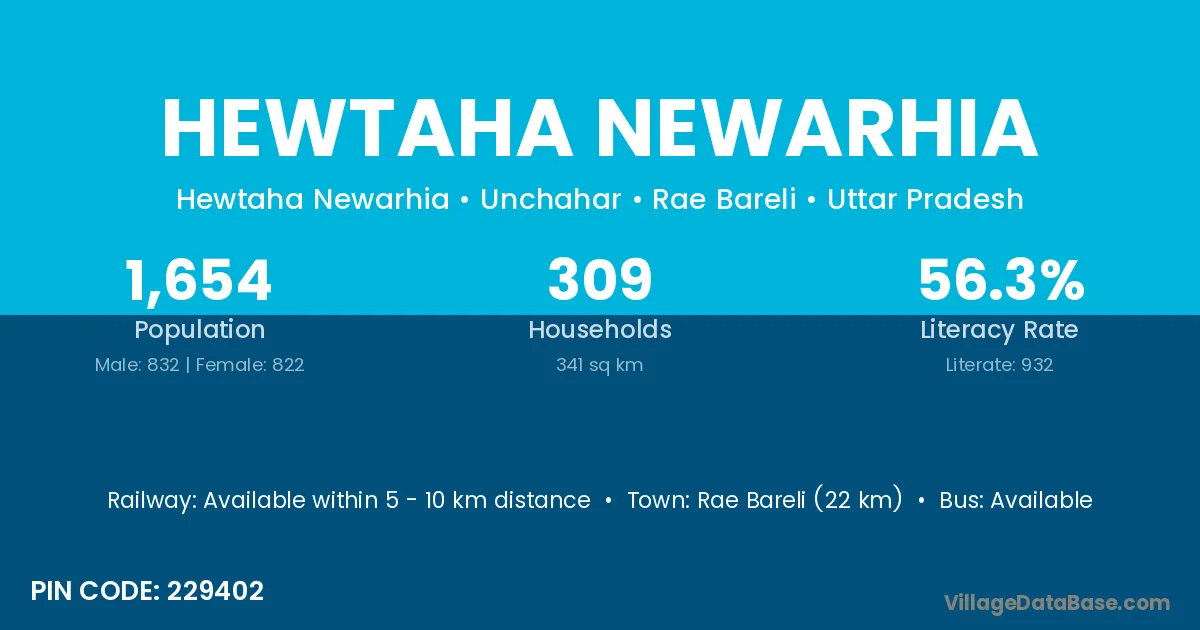 Rae Bareli (22 km) is the nearest town to Hewtaha Newarhia village for major economic activities and is located approximately 22 km away.