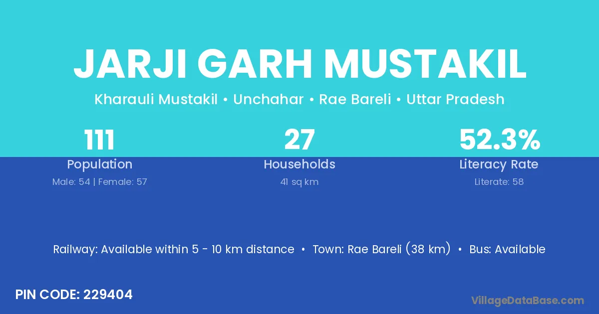 Rae Bareli (38 km) is the nearest town to Jarji Garh Mustakil village for major economic activities and is located approximately 38 km away.
