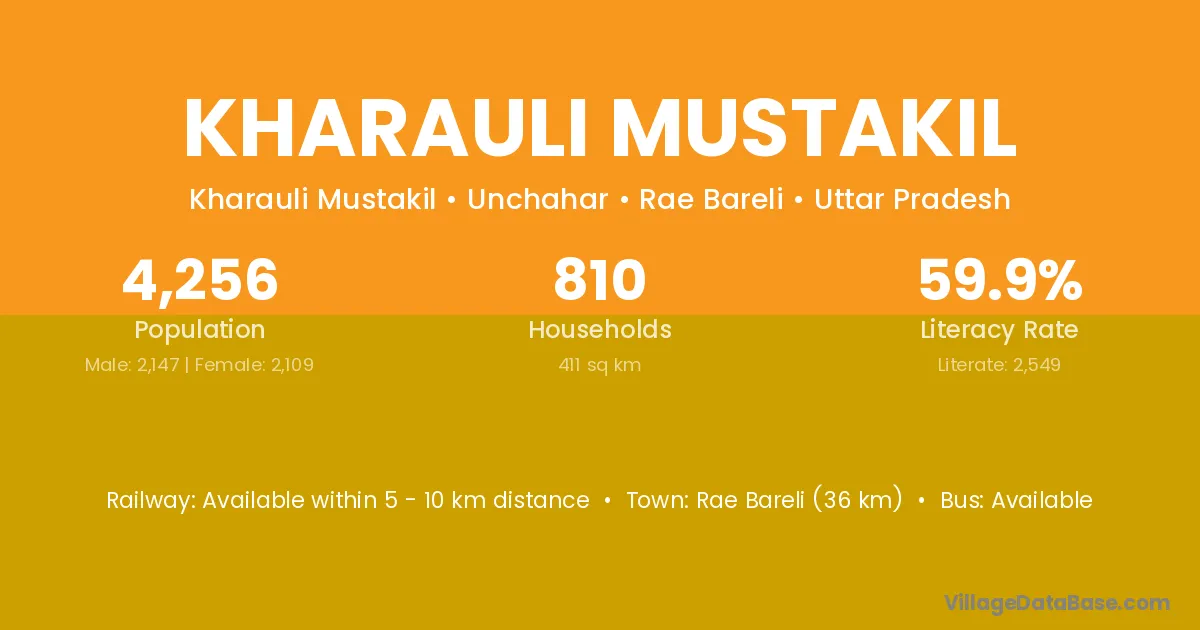 Rae Bareli (36 km) is the nearest town to Kharauli Mustakil village for major economic activities and is located approximately 36 km away.