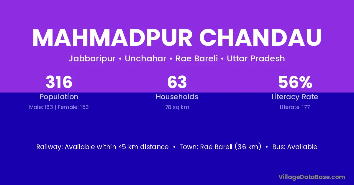 Rae Bareli (36 km) is the nearest town to Mahmadpur Chandau village for major economic activities and is located approximately 36 km away.