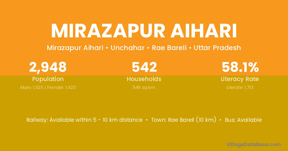 Rae Bareli (10 km) is the nearest town to Mirazapur Aihari village for major economic activities and is located approximately 10 km away.