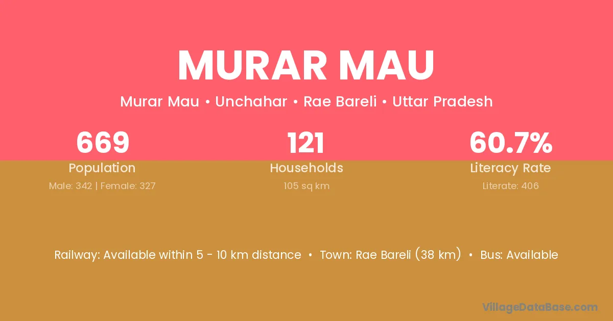 Rae Bareli (38 km) is the nearest town to Murar Mau village for major economic activities and is located approximately 38 km away.