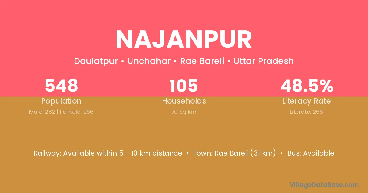 Rae Bareli (31 km) is the nearest town to Najanpur village for major economic activities and is located approximately 31 km away.