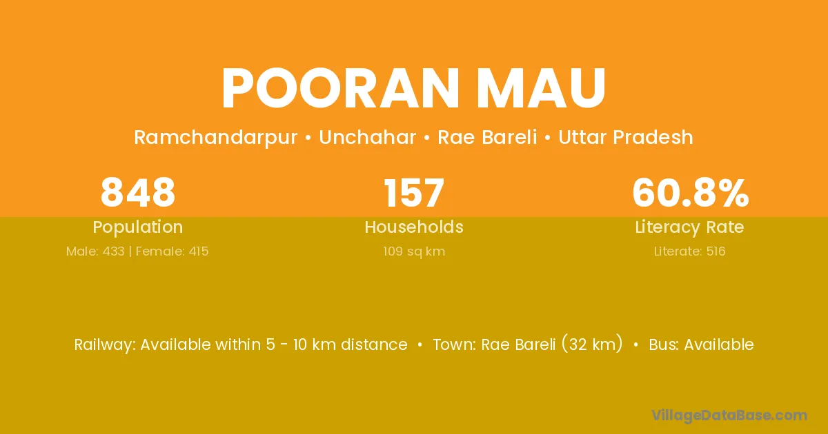 Rae Bareli (32 km) is the nearest town to Pooran Mau village for major economic activities and is located approximately 32 km away.