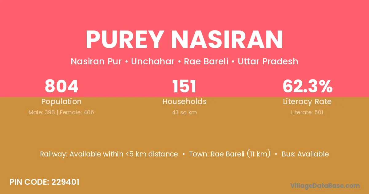 Rae Bareli (11 km) is the nearest town to Purey Nasiran village for major economic activities and is located approximately 11 km away.