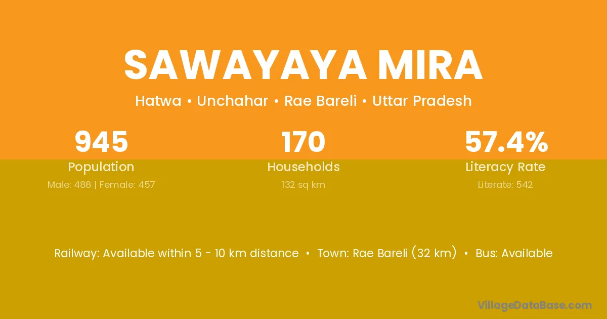 Rae Bareli (32 km) is the nearest town to Sawayaya Mira village for major economic activities and is located approximately 32 km away.