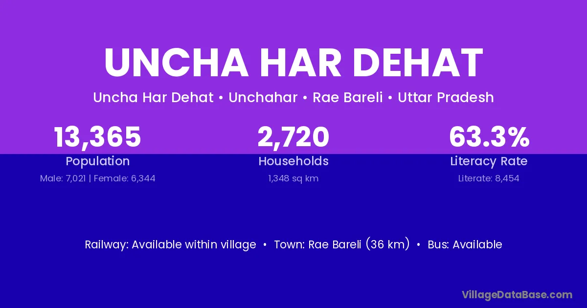 Uncha Har Dehat village has a total population of 13,365 people, of which 7,021 are males and 6,344 are females.