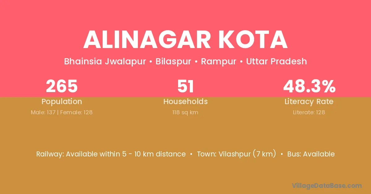 Vilashpur (7 km) is the nearest town to Alinagar Kota village for major economic activities and is located approximately 7 km away.