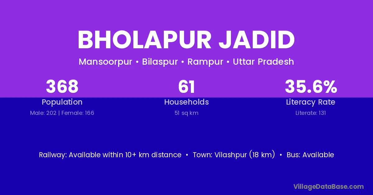 Vilashpur (18 km) is the nearest town to Bholapur Jadid village for major economic activities and is located approximately 18 km away.