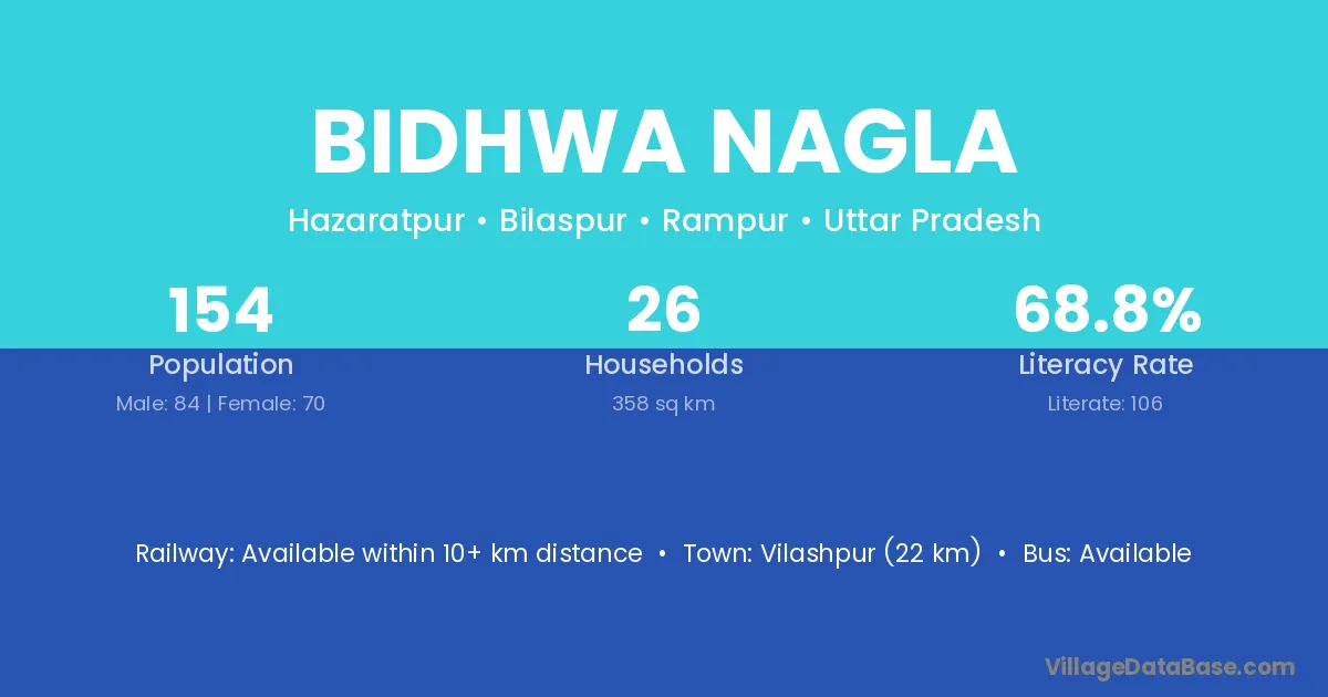 Vilashpur (22 km) is the nearest town to Bidhwa Nagla village for major economic activities and is located approximately 22 km away.