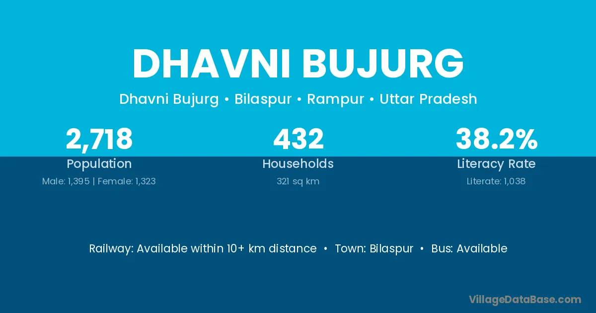 Dhavni Bujurg village has a total population of 2,718 people, of which 1,395 are males and 1,323 are females.