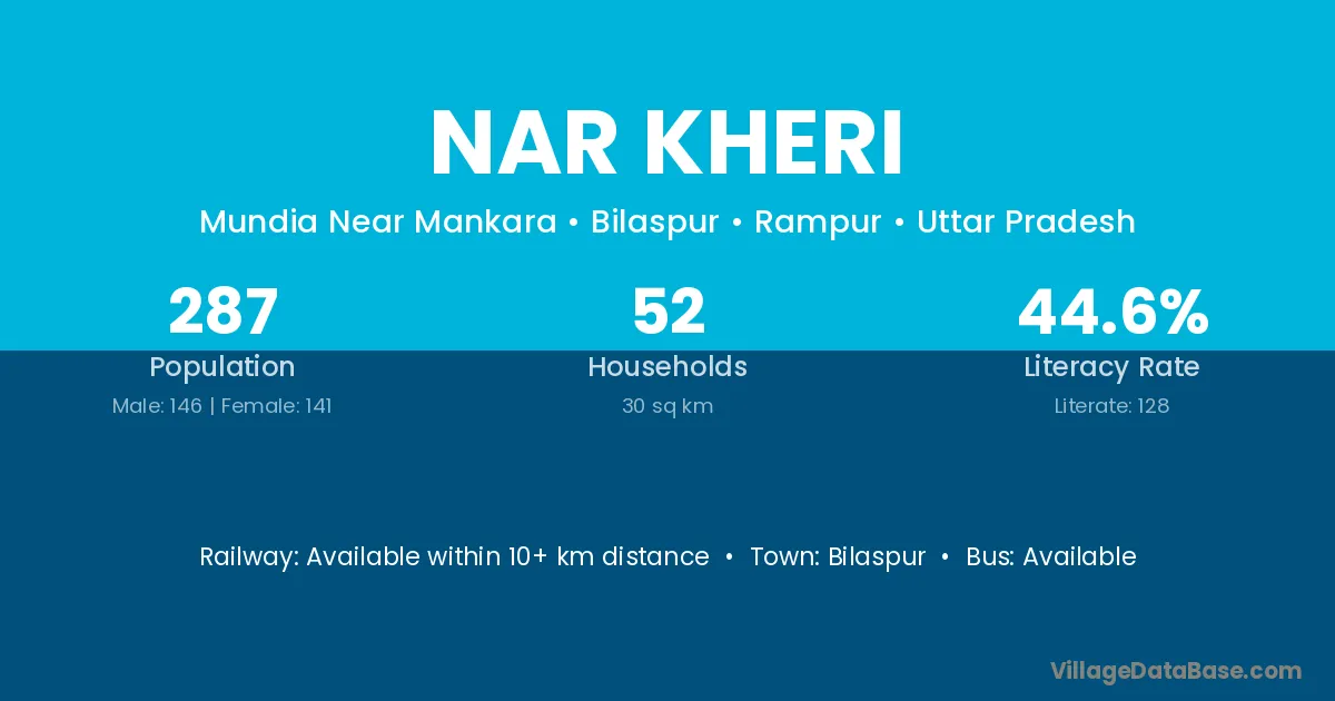 Nar Kheri village has a total population of 287 people, of which 146 are males and 141 are females.
