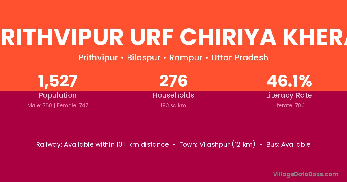 Vilashpur (12 km) is the nearest town to Prithvipur Urf Chiriya Khera village for major economic activities and is located approximately 12 km away.