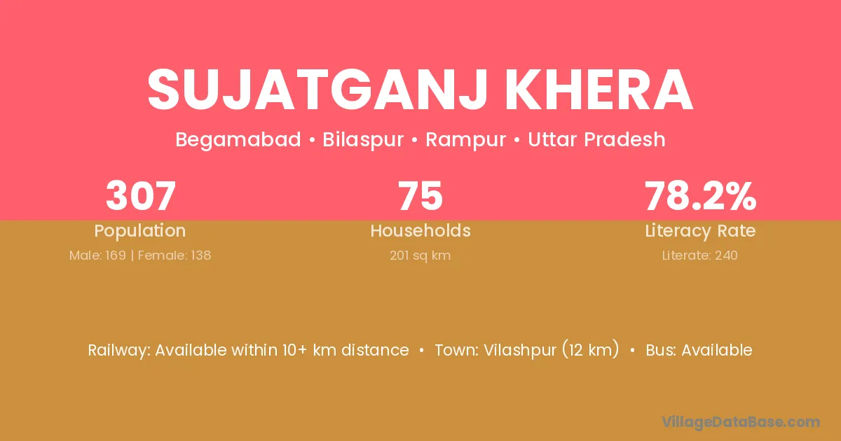 Vilashpur (12 km) is the nearest town to Sujatganj Khera village for major economic activities and is located approximately 12 km away.