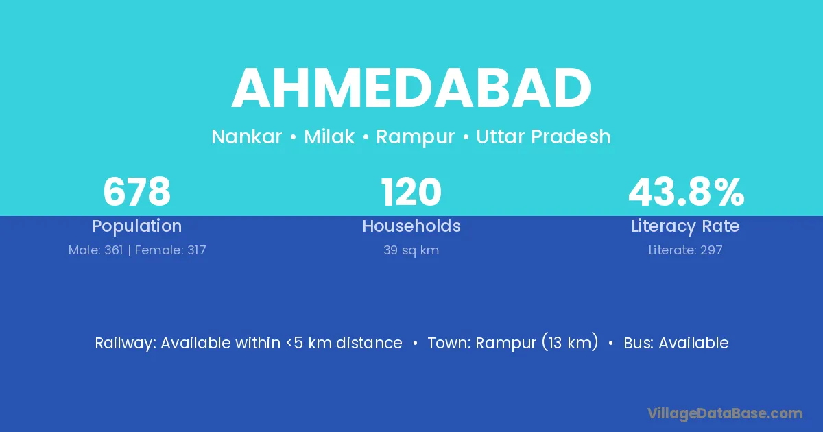 Rampur (13 km) is the nearest town to Ahmedabad village for major economic activities and is located approximately 13 km away.