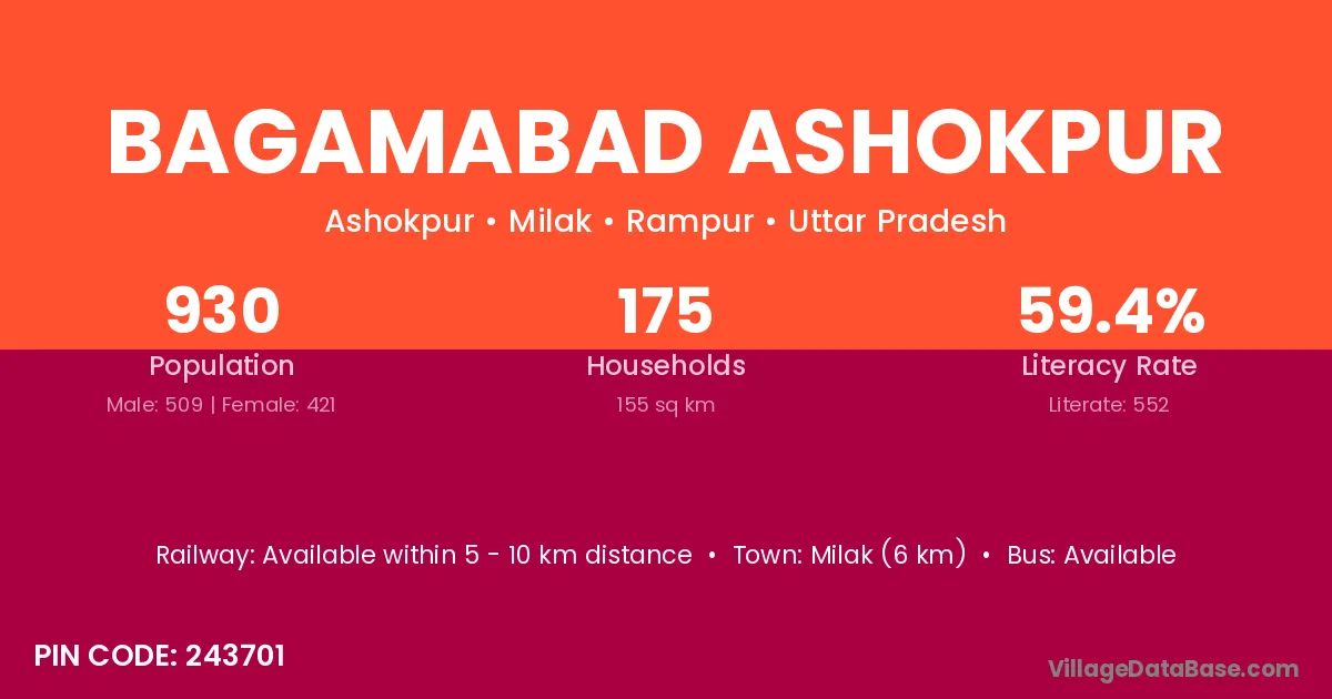 Bagamabad Ashokpur village has a total population of 930 people, of which 509 are males and 421 are females.