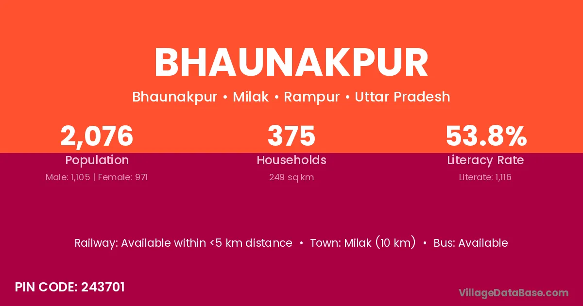 Milak (10 km) is the nearest town to Bhaunakpur village for major economic activities and is located approximately 10 km away.