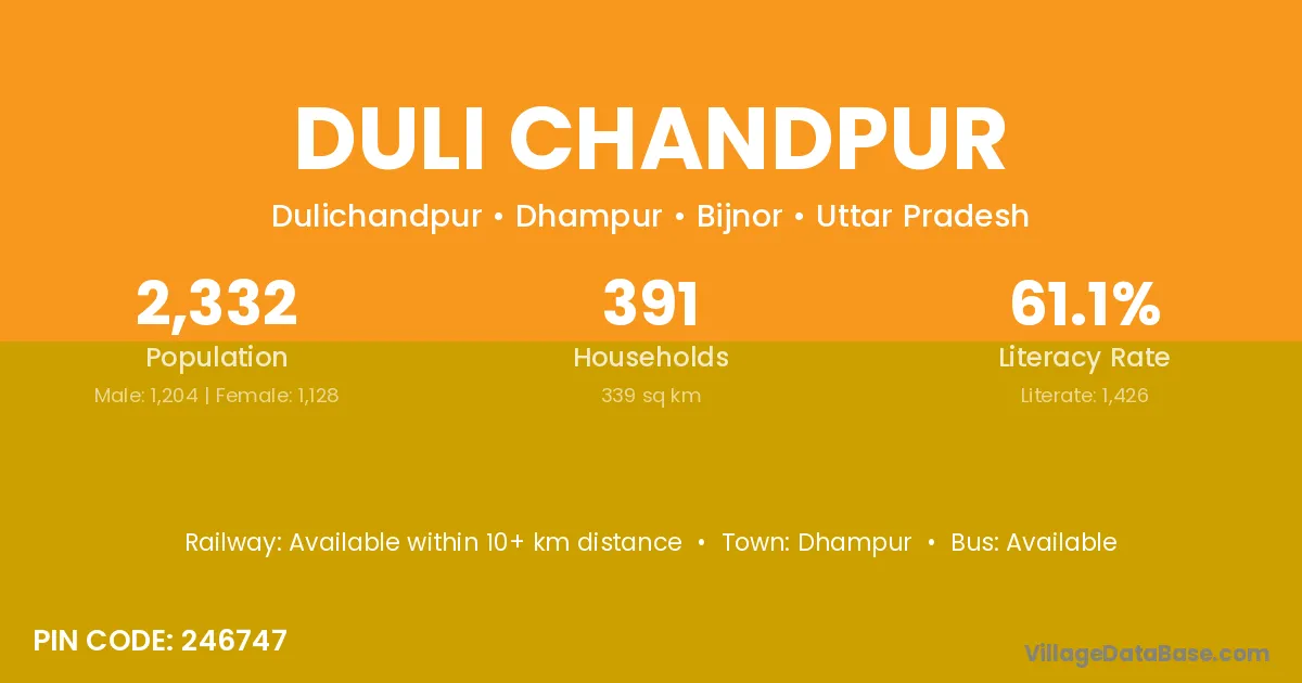 Milak (14 km) is the nearest town to Duli Chandpur village for major economic activities and is located approximately 14 km away.