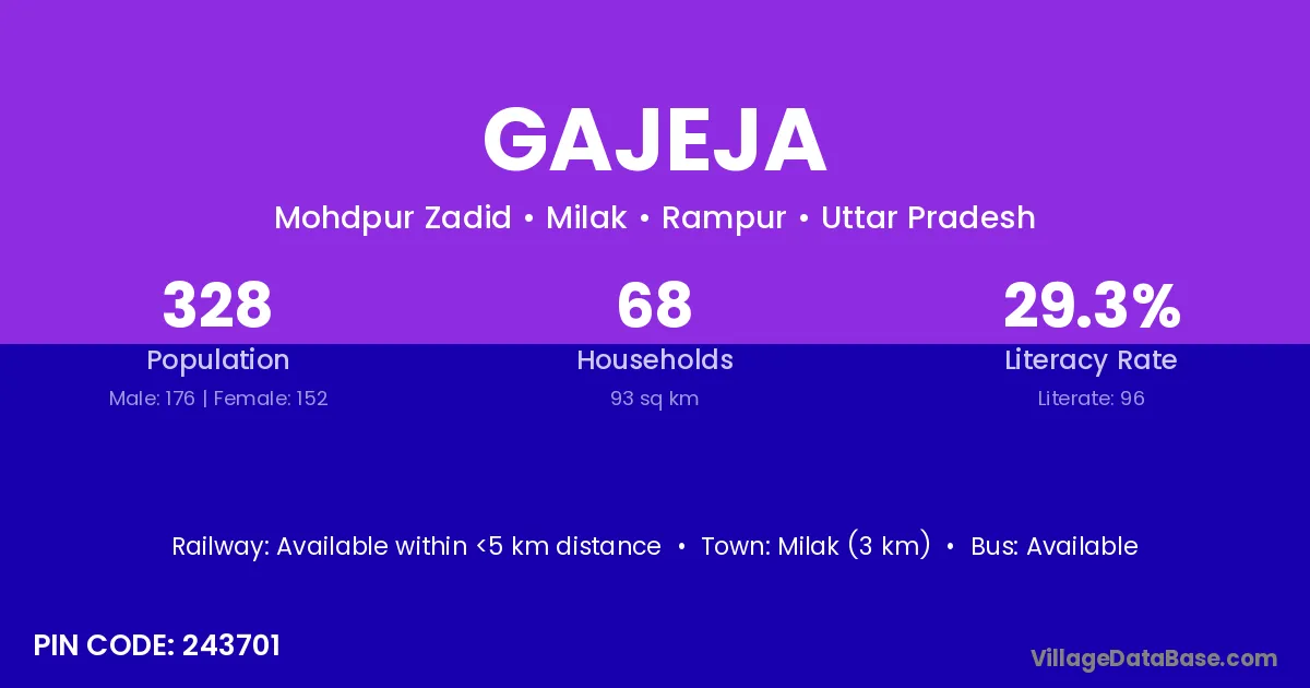 Milak (3 km) is the nearest town to Gajeja village for major economic activities and is located approximately 3 km away.