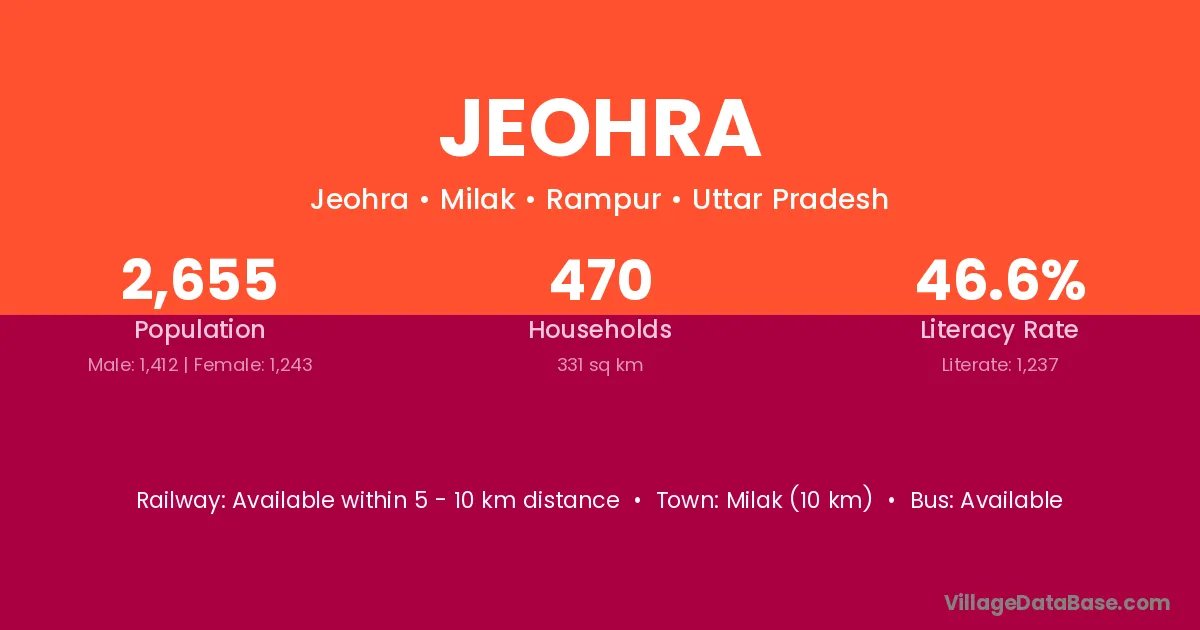 Jeohra village has a total population of 2,655 people, of which 1,412 are males and 1,243 are females.