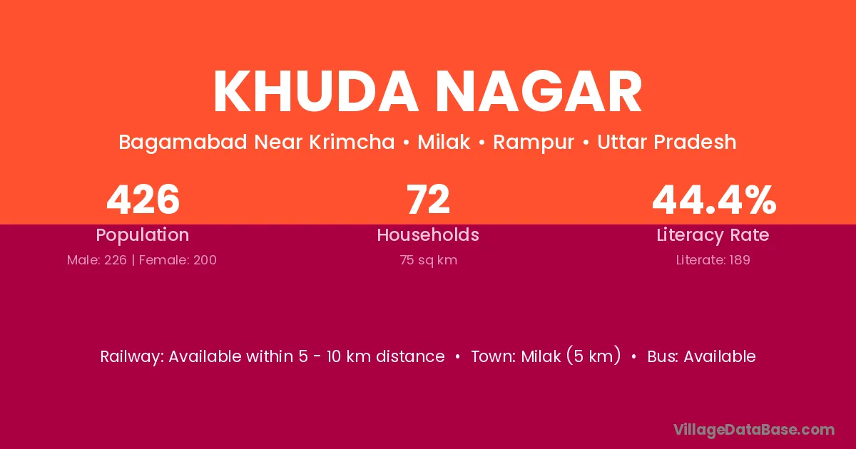 Milak (5 km) is the nearest town to Khuda Nagar village for major economic activities and is located approximately 5 km away.