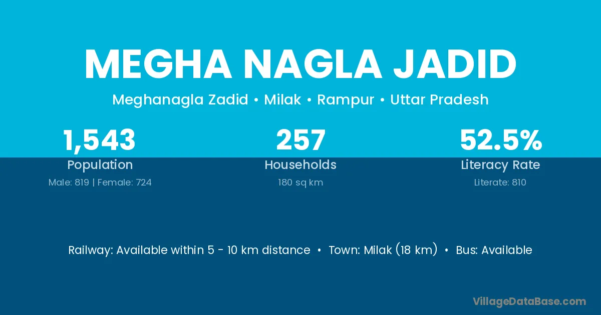 Milak (18 km) is the nearest town to Megha Nagla Jadid village for major economic activities and is located approximately 18 km away.