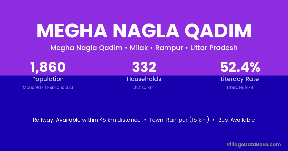 Rampur (15 km) is the nearest town to Megha Nagla Qadim village for major economic activities and is located approximately 15 km away.