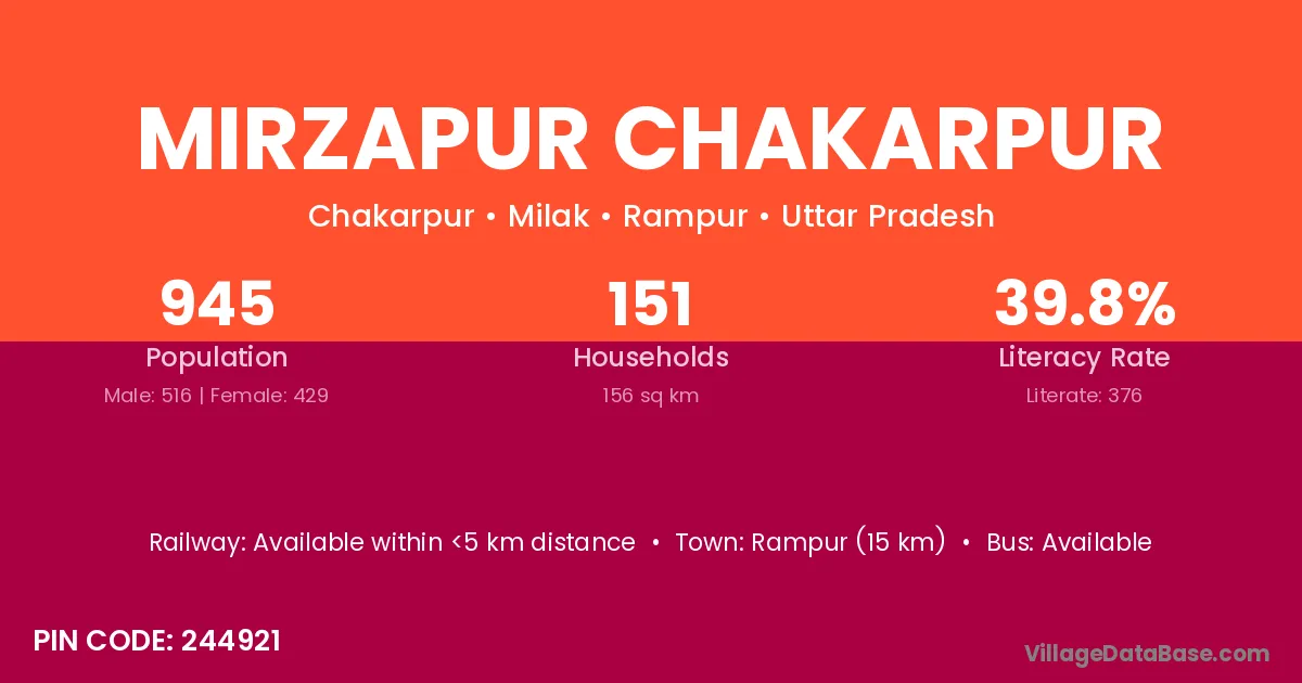 Mirzapur Chakarpur village has a total population of 945 people, of which 516 are males and 429 are females.