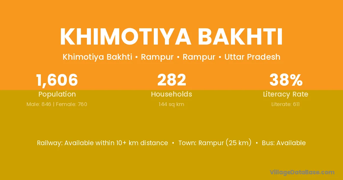 Rampur (25 km) is the nearest town to Khimotiya Bakhti village for major economic activities and is located approximately 25 km away.