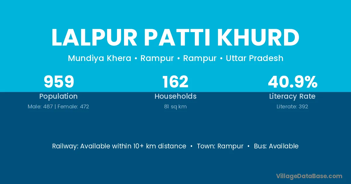 Lalpur Patti Khurd village has a total population of 959 people, of which 487 are males and 472 are females.