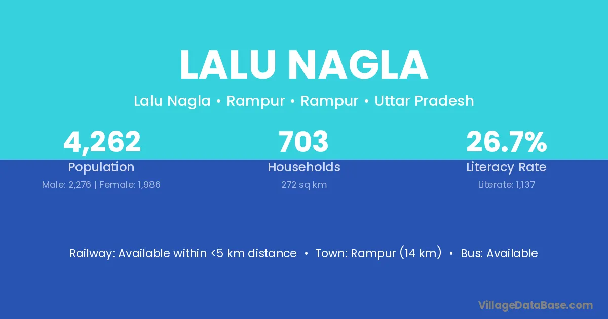 Rampur (14 km) is the nearest town to Lalu Nagla village for major economic activities and is located approximately 14 km away.