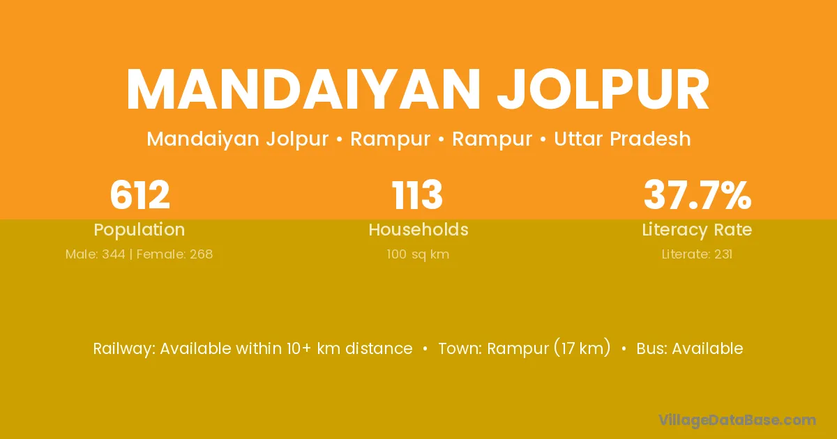 Rampur (17 km) is the nearest town to Mandaiyan Jolpur village for major economic activities and is located approximately 17 km away.