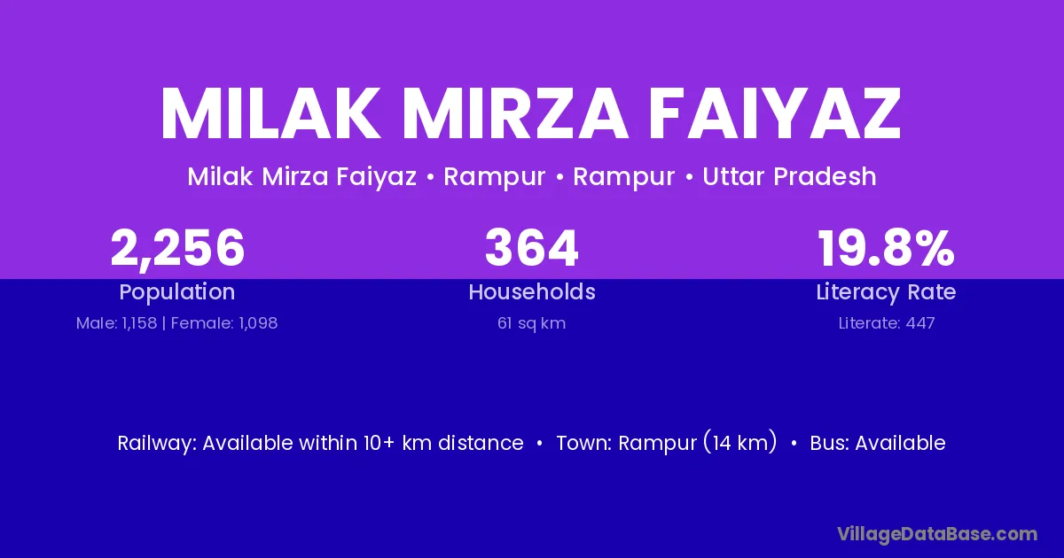 Rampur (14 km) is the nearest town to Milak Mirza Faiyaz village for major economic activities and is located approximately 14 km away.