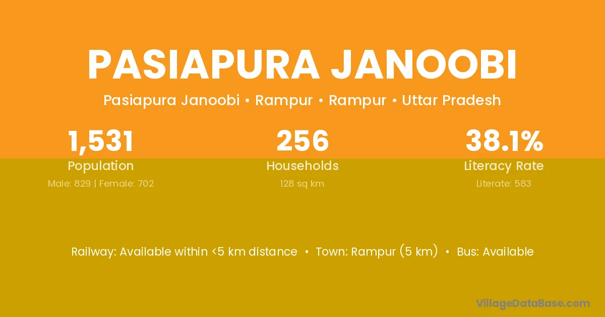 Rampur (5 km) is the nearest town to Pasiapura Janoobi village for major economic activities and is located approximately 5 km away.