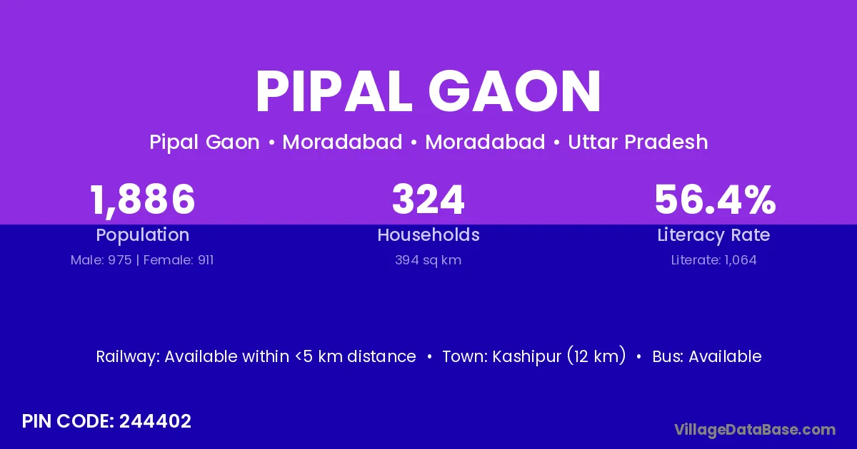 Rampur (14 km) is the nearest town to Pipal Gaon village for major economic activities and is located approximately 14 km away.