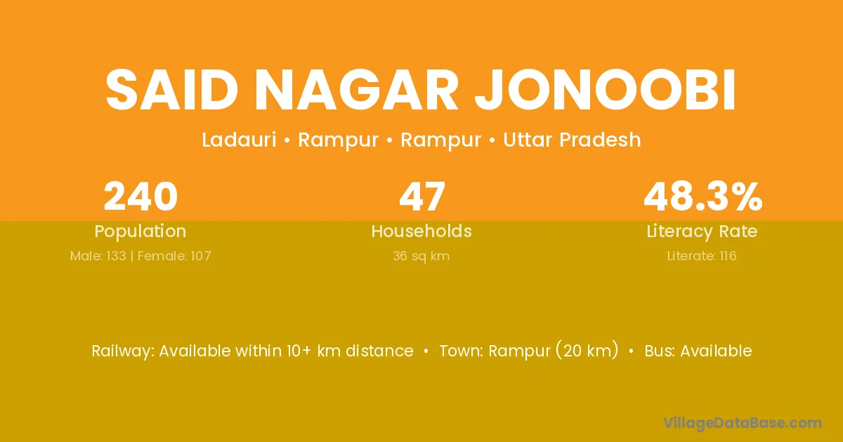 Rampur (20 km) is the nearest town to Said Nagar Jonoobi village for major economic activities and is located approximately 20 km away.